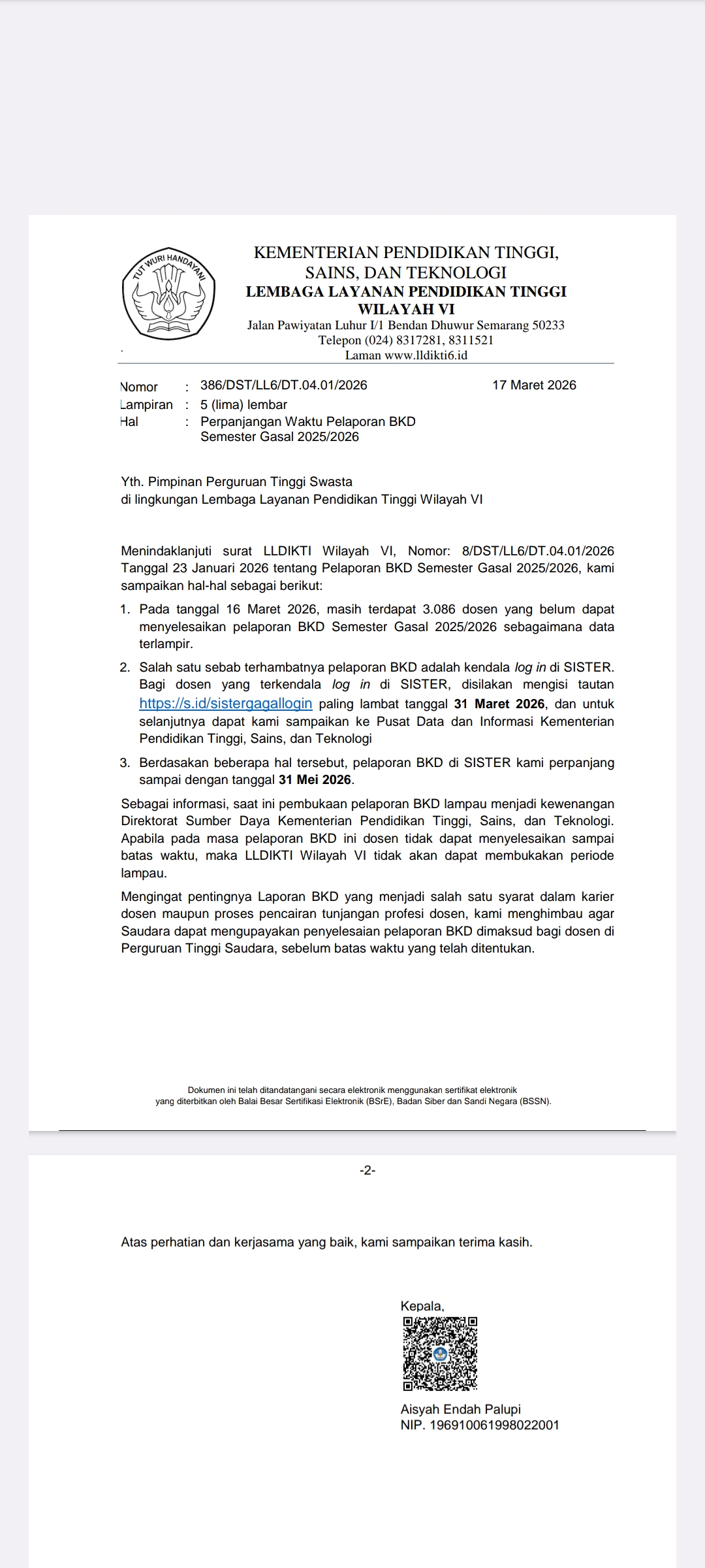 โโฐ Tenggat Waktu Baru: Pelaporan BKD di SISTER diperpanjang sampai tanggal 31 Mei 2026.