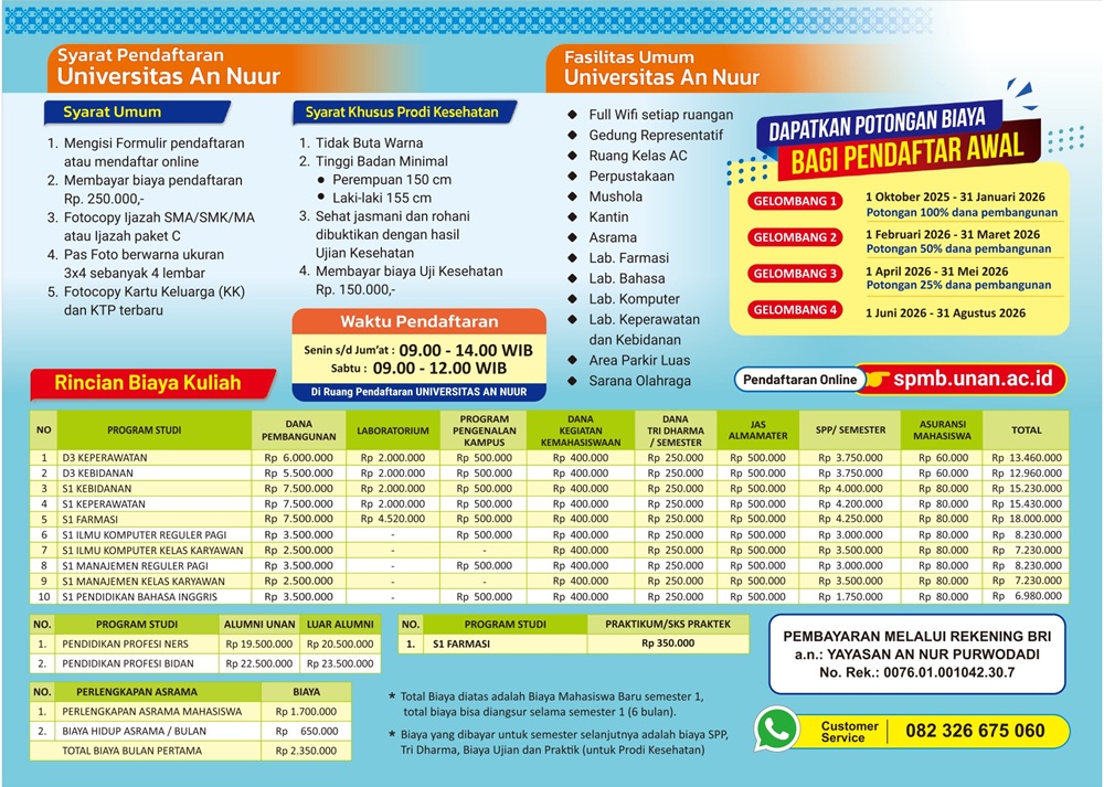 Setiap periode pendaftaran dibagi menjadi beberapa gelombang, di mana masing-masing gelombang menawarkan potongan biaya pendaftaran yang berbeda. Hal ini dilakukan sebagai bentuk dukungan Universitas An Nuur untuk mempermudah akses pendidikan berkualitas tanpa terbebani biaya yang tinggi. Dengan mendaftar di gelombang lebih awal, calon mahasiswa bisa mendapatkan potongan biaya yang lebih besar, menjadikan kesempatan untuk memulai perjalanan pendidikan semakin terbuka.